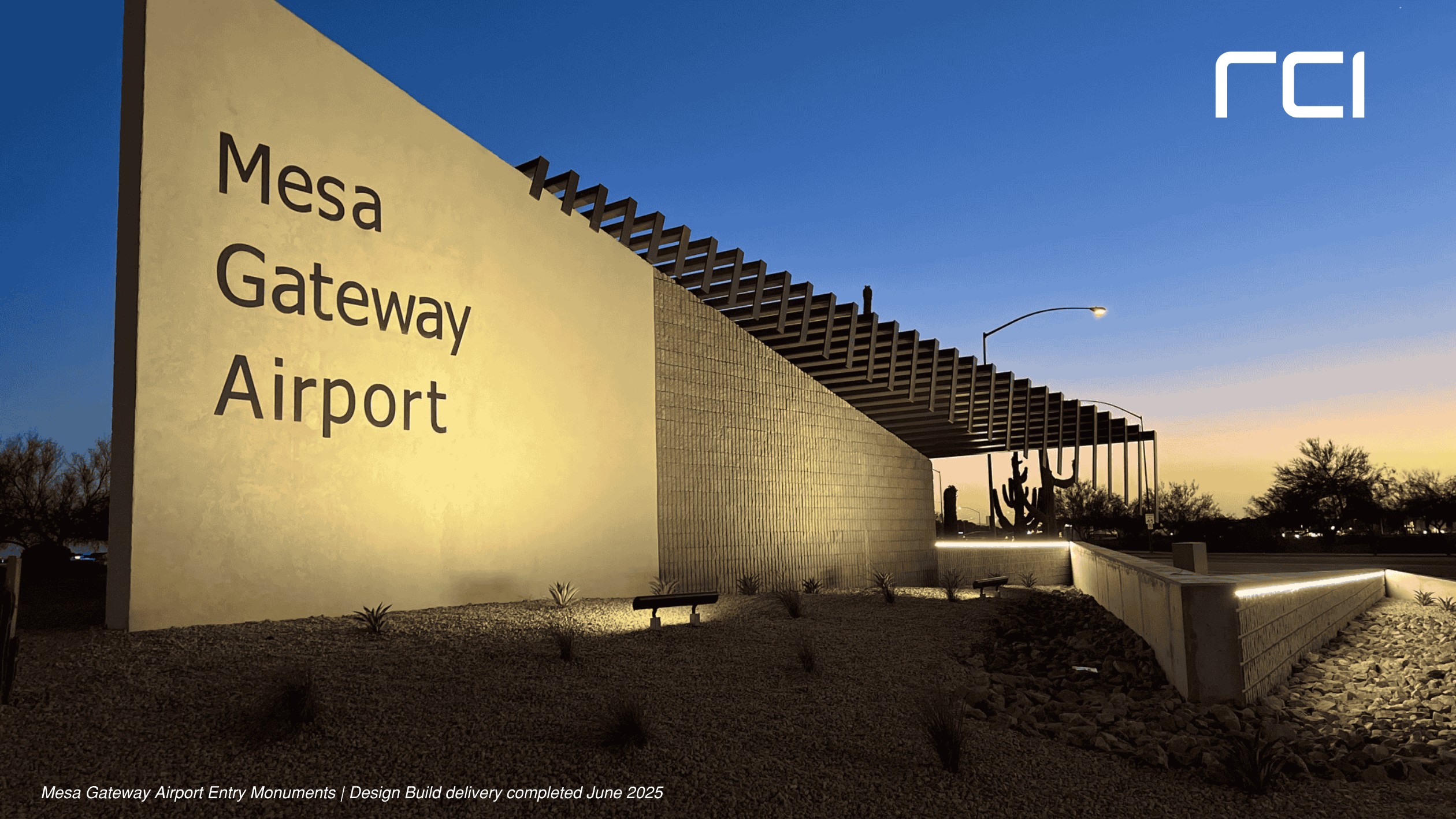 RCI transitioned early from residential redevelopment into commercial and public sector construction and today focuses on municipal and federal infrastructure programs. The firm has conducted work for multiple Arizona municipalities and public agencies such as the FAA and Army Corps of Engineers, as well as delivered projects at major aviation facilities such as Phoenix Sky Harbor and Mesa Gateway Airport. Most recently, RCI completed the 2025 design build Entry Monuments project at Mesa Gateway Airport, a signature infrastructure project that has redefined the primary public entry experience for the Valley’s second largest commercial airport.